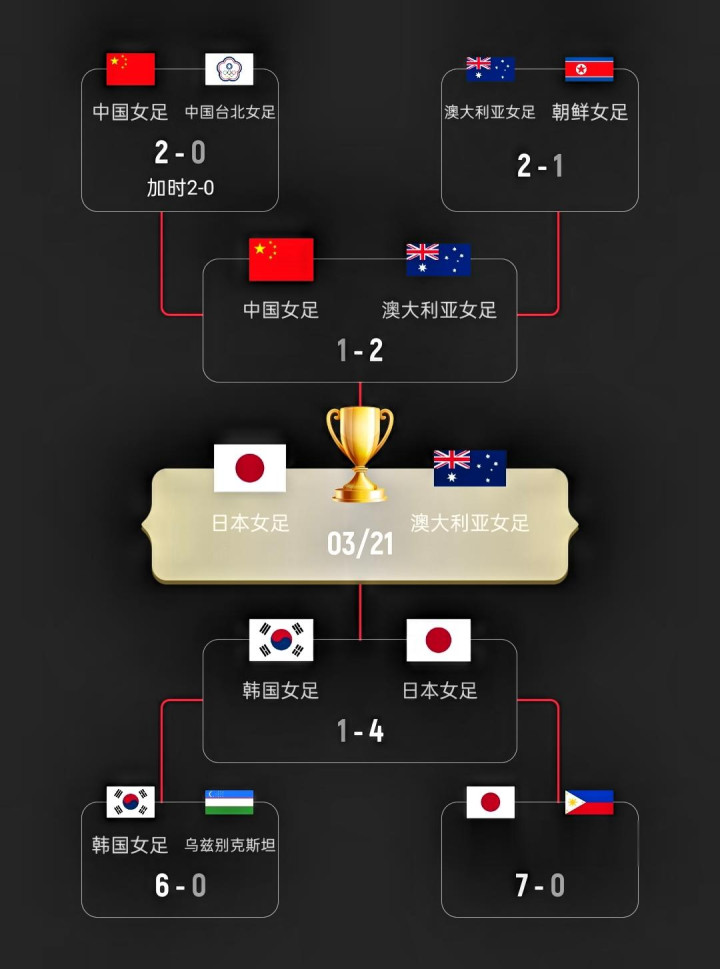 而在此前进行的半决赛中,中国女足在主力队员王霜停赛的情况下去,以1-2负于了东道主澳大利亚女足,无缘晋级本届亚洲杯的决赛。另外一场半决赛中,日本女足则以4-1的比分击败了韩国女足。3月21日,日本队将与澳大利亚队争夺本届亚洲杯的最终冠军。
